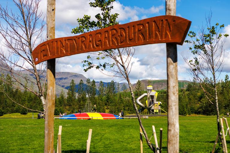 The Adventure Park (Ævintýragarðurinn) is located in Ullarnesbrekkur between Varmá and Leirvogstunga in Mosfellsbær and features exciting climbing and obstacle equipment. At its center is a popular climbing net, alongside a frisbee golf course and a bouncy pillow. Significant effort has been made to develop trails and plant vegetation in the area, with a paved and illuminated main path running through the park, complete with a rose plaza in the middle and walking bridges at either end. From the main path, a gravel "edible trail" branches off, where various edible plants, including many types of berry bushes, have been planted. In the southern part of the park, near the sports fields, there is a dog park where owners can let their dogs roam freely under supervision.
