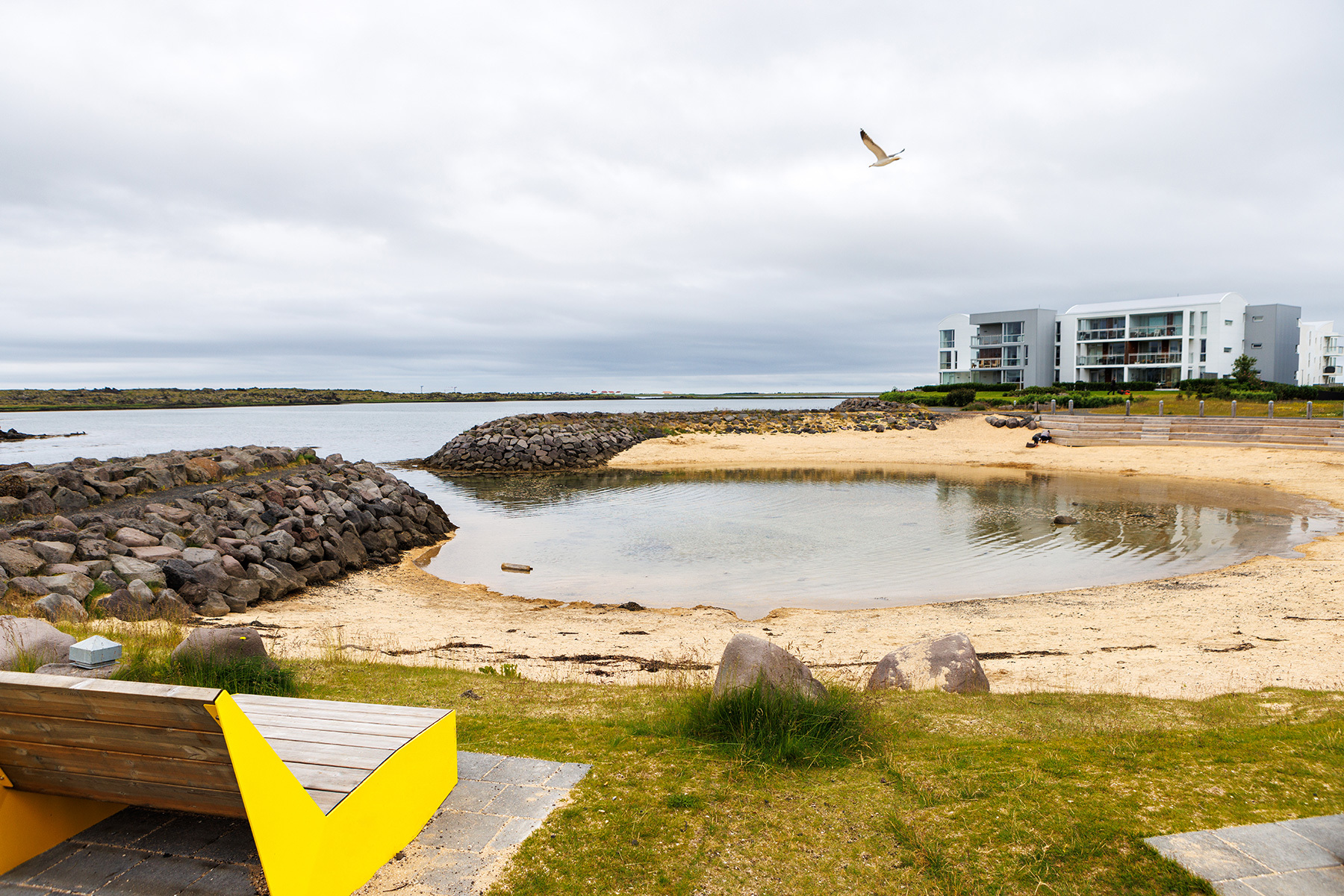 The beach in the Sjáland neighborhood is a highly popular outdoor area, especially on sunny days. It’s the perfect spot to bring a shovel and bucket, as the shore features light shell sand, and searching for crabs, shells, and sea snails is always fun. Nearby, there is a playground and a small soccer field, with benches and tables available, making it an ideal location for a picnic. During the summer, restroom facilities and an outdoor shower are also available on-site.